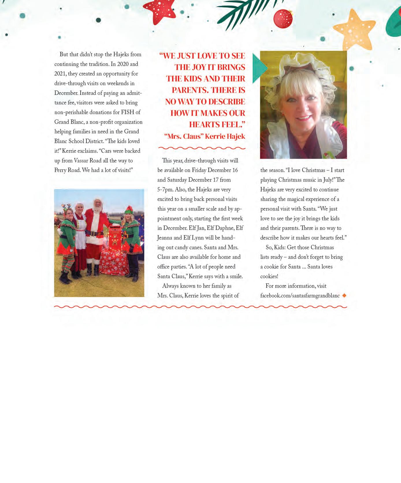 Finally, this issue certainly has a holiday feel – festive and fun things to do locally and just out-of-town, plus shopping, cookies and Santa! (He lives in Grand Blanc, you know.)