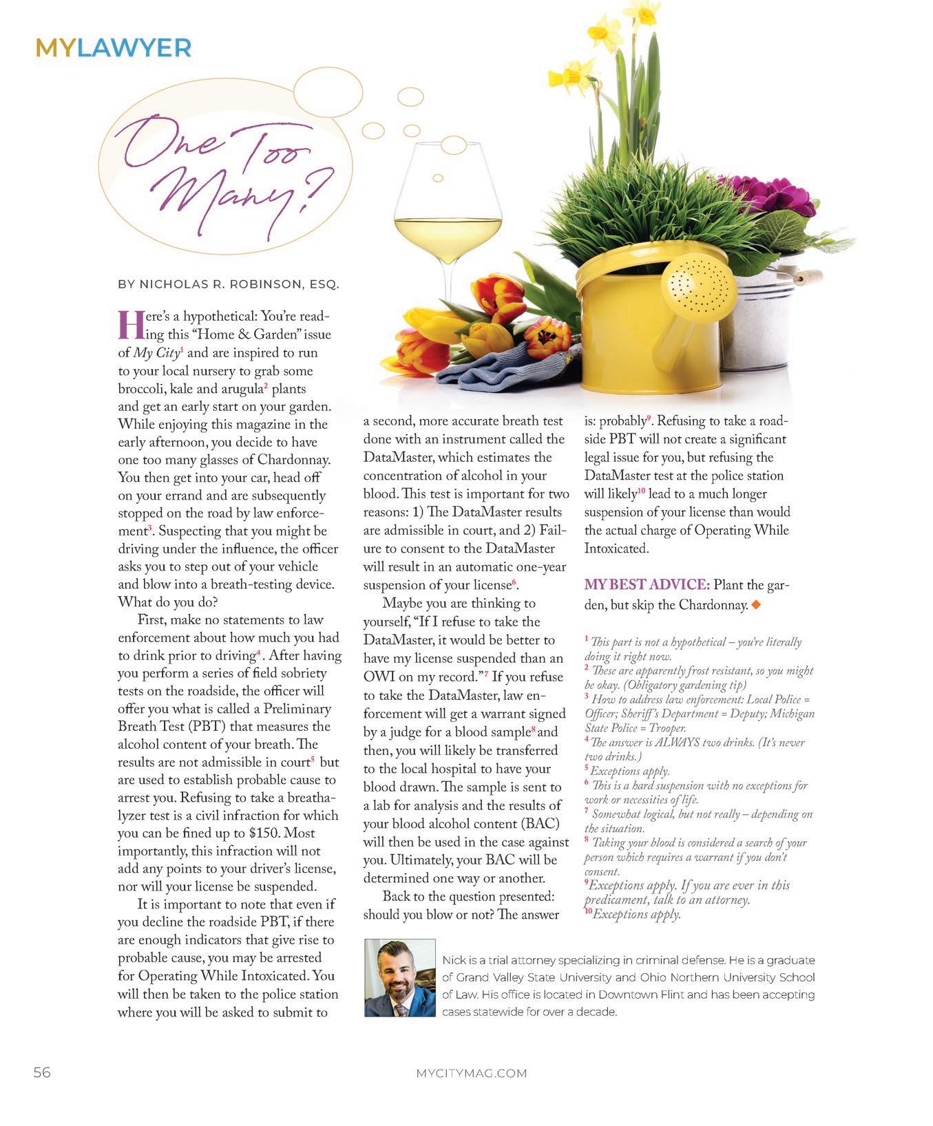 As we start planning our warm weather fun, most of us have made a list of the DIY projects we want to get started and decided what we want to plant in our gardens. Can’t wait! Maybe you’re preparing for your rst foray into the world of gardening or perhaps you’re approaching the expert level. Check out our feature on the Master Gardeners Association of Genesee County Michigan and the MSU Extension Master Gardener program – so many people are dedicated to helping beautify and educate our communities, and much more (p.18). Our “My Dish” contributor Erin Caudell is also an accomplished farmer, o ering an abundance of produce to area residents through Flint Ingredient Co. and Weekly Greens CSA (community supported agriculture). See “Healthy Harvest” on p.14. On the “Home” side, we also have some trending ideas for hitting the re-fresh button on your interior décor, DIY style.