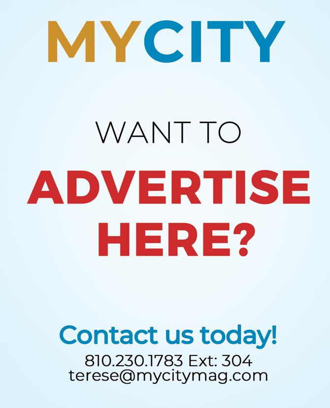 14165 FENTON RD., FENTON, MI 48430 810.230.1783 - MYCITYMAG.COM ISSN#1559-3436 is published monthly by My City Magazine, Inc., 14165 Fenton Rd. Fenton, MI 48430. Canadian Mail Agreement #41971515. For back issues, inquire for availability. Editorial Correspondence: Address product information and inquiries to: Editorial Department, My City Magazine, 14165 Fenton Rd., Fenton, MI 48430, phone 810.230.1783. To authors, photographers and people featured in this publication: All materials, articles, reports and photographs in this publication are the property of My City Magazine and cannot be used without written permission. The opinions and conclusions recited herein are those of the respective authors and not of My City Magazine. My City Magazine is not responsible for