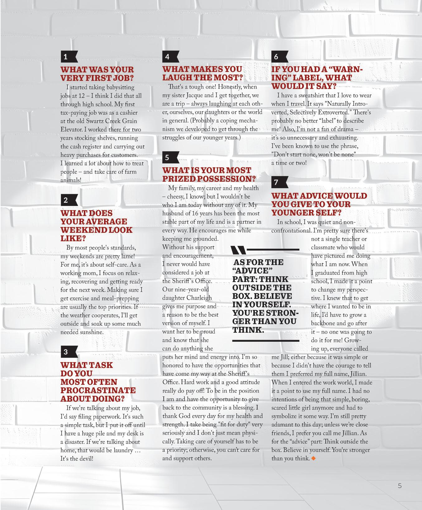 To acknowledge Law Day (May 1), we are highlighting members of the Greater Flint legal community. Included is a “7 Questions” pro le of Captain Jillian Macey, the rst woman to ll the role of Genesee County Corrections Administrator. Also featured is the Community Resolution Center, a group of professionals celebrating 30 years of helping people resolve legal con icts outside of a courtroom. And we take a look at the MADE Institute – standing for Money, Attitude, Direction and Education – they provide programs and initiatives to help people transition from jail cells to living successful lives. Finally, local criminal defense lawyer Nicholas Robinson o ers his expertise with a timely article about the process of jury selection. We appreciate those who helped us share these stories with you.