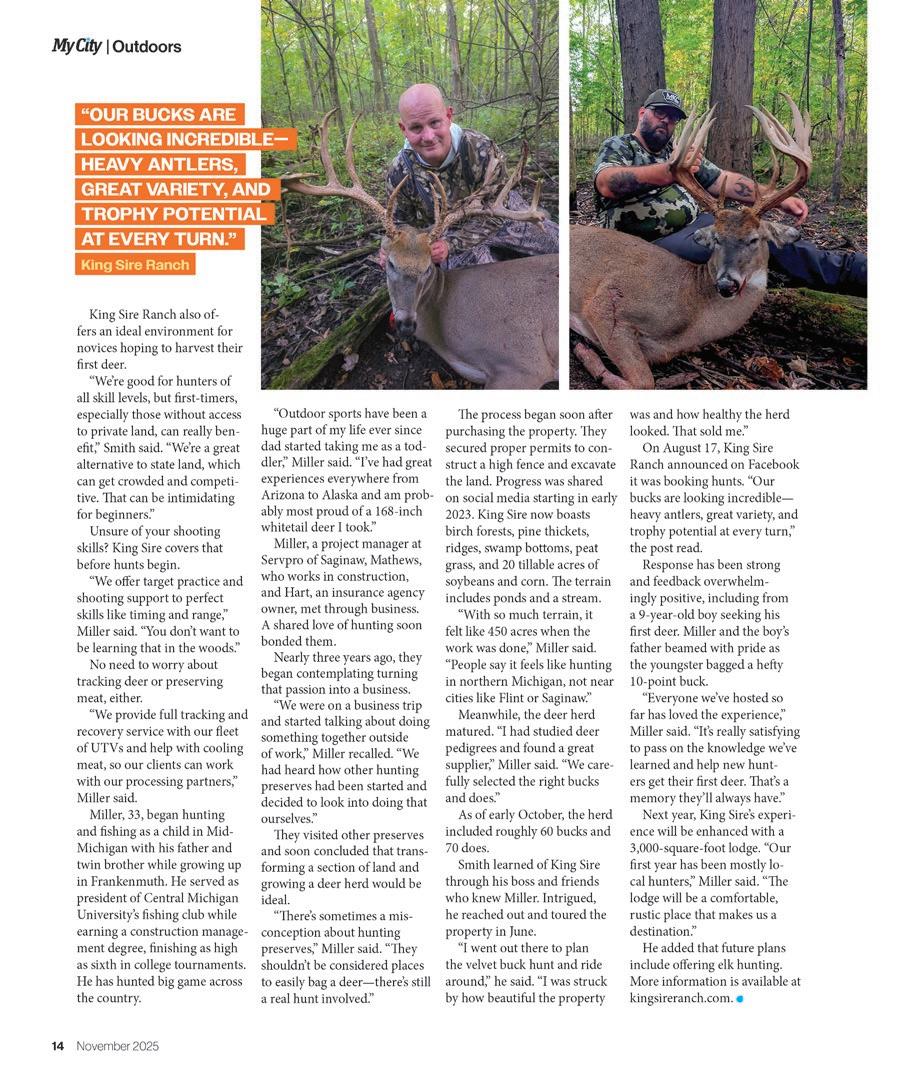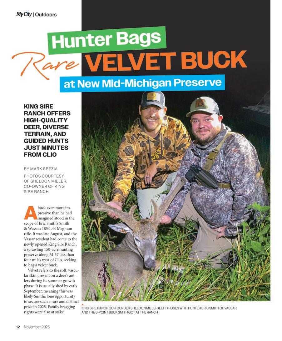 Also, be sure to check out Mark Spezia’s article on rearm deer season. Guided hunting is available in Genesee County at two preserves located just four miles apart along M-57—King Sire Ranch in Clio and Masterpiece Whitetails in Montrose. In this issue, Mark takes an in depth look at King Sire Ranch and what it has to o er hunters. Another featured story highlights Jackie Mason’s unique side business, Sassy Little Seamstress. Driven by a passion for helping others in the community, Jackie’s journey is a powerful story of hard work, creativity, and compassion.