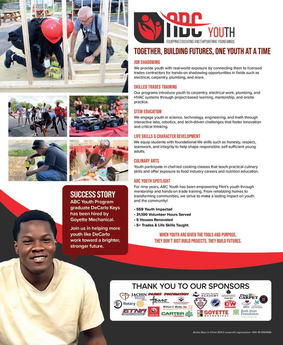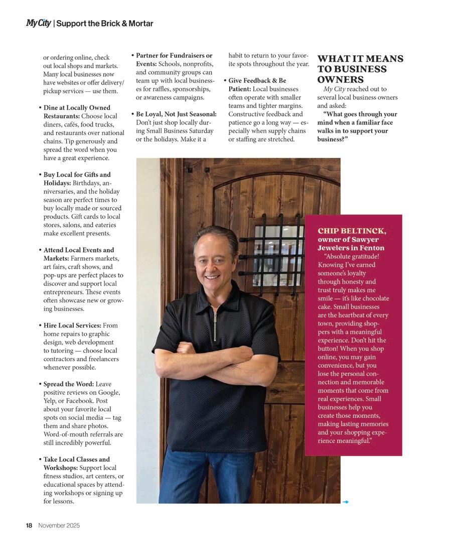 In this month’s issue, we’re including our annual special section called My City Cares. A er all, November is a time to be thankful and to care for our loved ones—as well as for others who may not be as fortunate. is section highlights local nonpro ts working tirelessly to support Greater Flint residents of all ages. To help o set their continually increasing costs, locally owned businesses—o en the backbone of successful communities—sponsor and donate to these organizations.