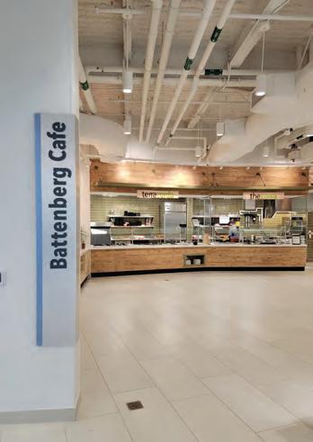 THE BATTENBERG CAFE SITS READY AT THE GROUND FLOOR TO PROVIDE FOOD AND BEVERAGE FOR A HUNGRY STUDENT ON THE GO. STUDENTS CAN EAT ANYWHERE IN THE BUILDING.
