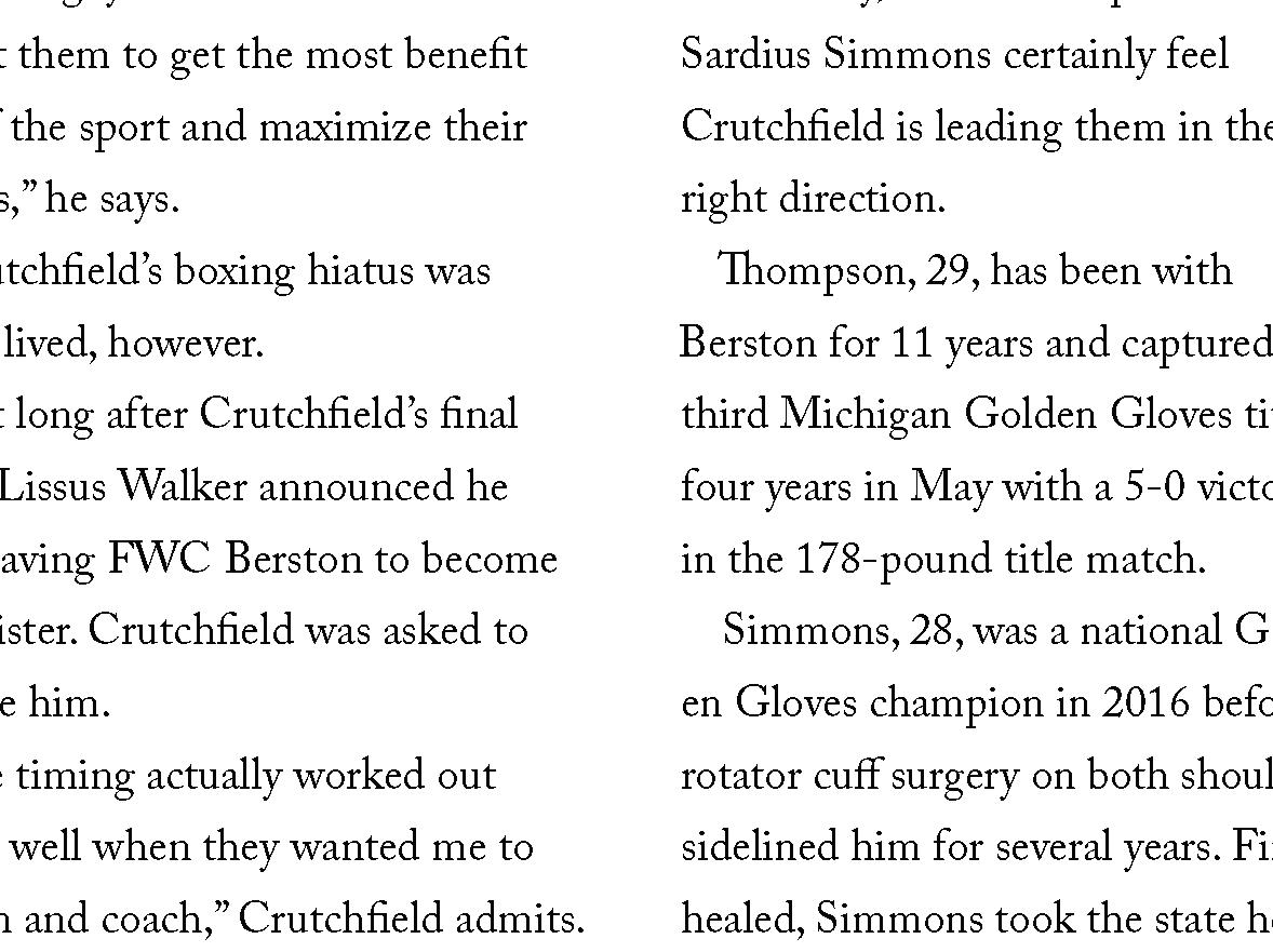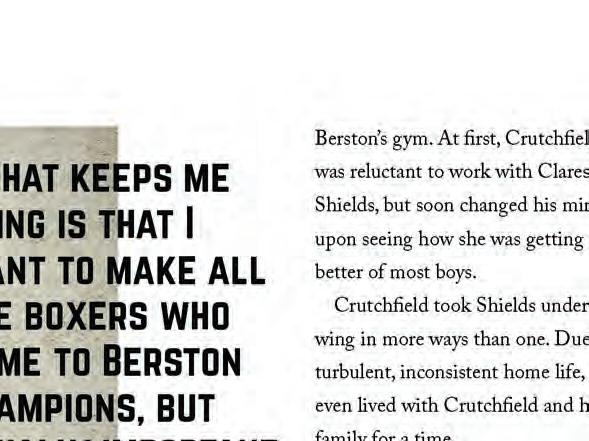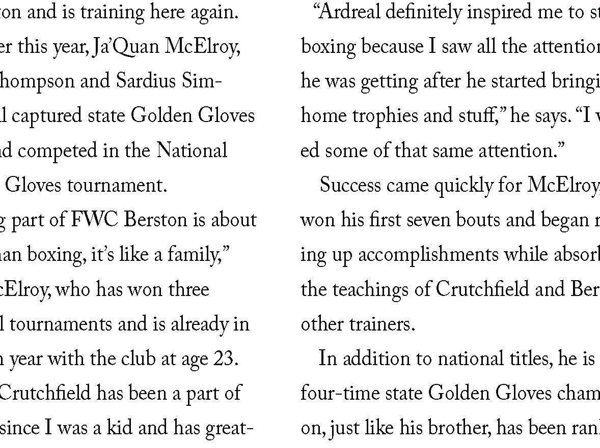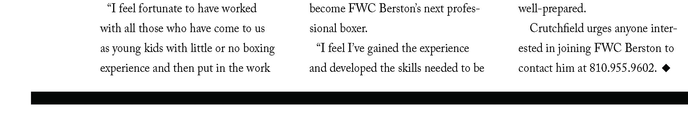 ° e word “history” takes on special meaning when you talk about Berston Field House and F.W.C. Berston Boxing. OOn p.50, Mark Spezia writes about the “blue collar basement boxing gym” that keeps churning out champions.
