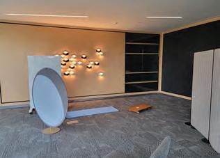 In 2016, Kettering began experimenting with a concept called a d.space. Started at Stanford University, a d.space is an area built entirely for students to meet, collaborate and work together to solve complex problems or complete projects. A standard d.space comes equipped with nearly everything needed for success including whiteboards, seating, electronic connectivity and WiFi, monitors and other tools. Each space can be set up EVERY COMMUNITY SPACE AND MEETING ROOM HOLDS THE TOOLS FOR STUDENTS TO WORK ON THEIR PROJECTS SINGLY OR IN A GROUP FORMAT. THE FLOATING OWENS CONFERENCE ROOM AND TOMUSKO REFLECTION STUDIO STAND OUT.