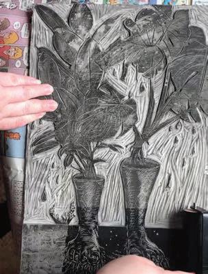 Linoleum printing (or linocut) is a relief printmaking technique in which you plan and carve out an image, McCoy explains. “ e ink is then rolled onto that carving and you can then create multiple impressions of that image. It’s like a large stamp.” Because