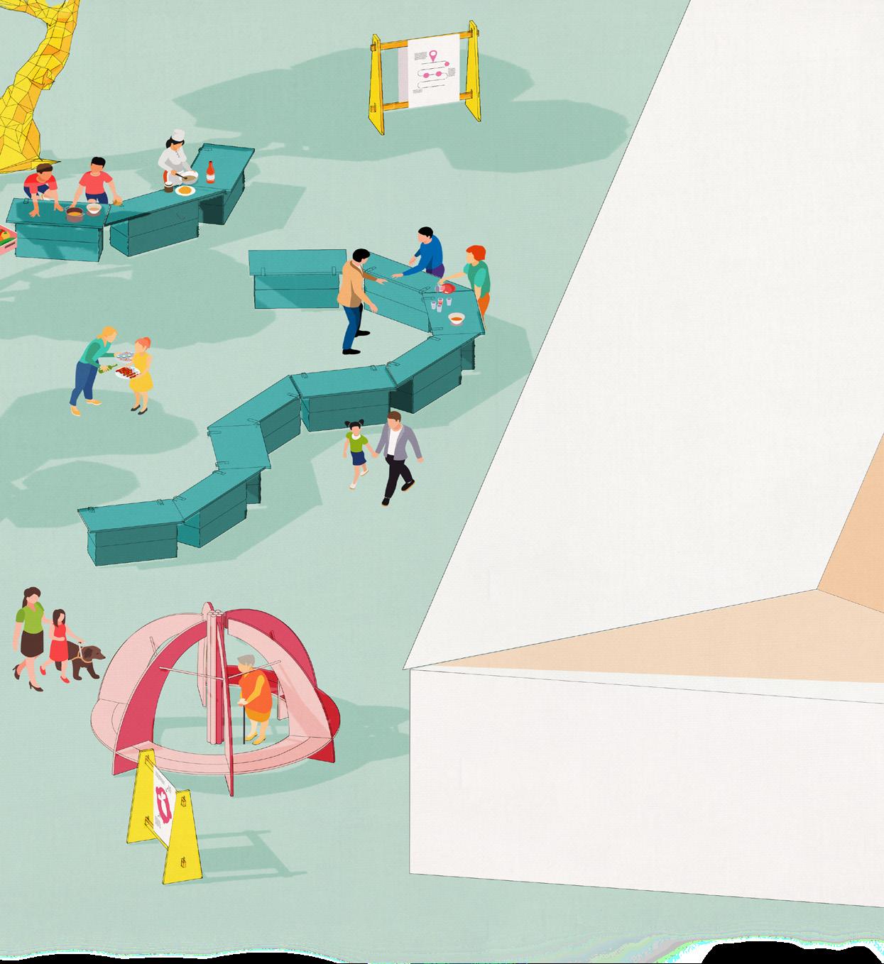 The proposal takes the form of a nomad carbon neutral school festival composed of various units. The kids’ cooking stalls and the tasting table are in the center, while the hut, the teaching and gaming panels are on the border of the festival. The first edition focuses on how to make the pink vegetables and fruits amusing for the children.