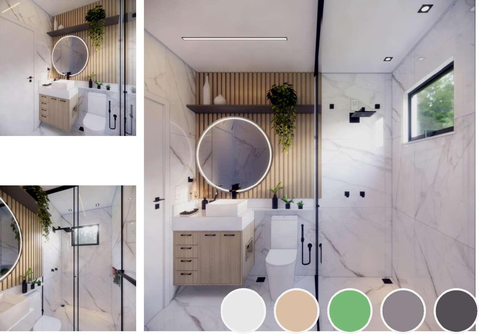 Este banheiro social segue o padrão de tonalidades da casa, com tons neutros contrastando com metais e cores em pontos focais. A mistura de texturas amadeiradas e metais pretos mantém o equilíbrio de cores no ambiente, enquanto o verde das plantas traz vida.