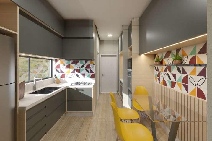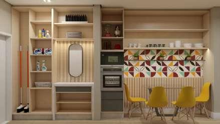 Por ficar situada em um estúdio de 35 metros quadrados, essa cozinha foi pensada de forma integrada com os demais ambientes, aproveitando o máximo do espaço de seus 7 metros quadrados com a utilização de janelas de fita e armário altos para um melhor aproveitamento de todo espaço, mantendo as decorações em estilo industrial de toda a habitação.