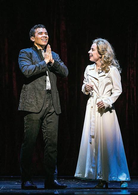 The talented cast adeptly handles the multiple levels of the material, with the three Broadway veterans at its center each giving top-notch performances. Jue, a longtime collaborator of Hwang’s, is delicious as the playwright’s onstage avatar; he gives a lovably nebbish, self-deprecating turn, playing into the plentiful humor of his dialogue and letting the deeper facets of his personality come through on their own. Louis is stunningly good in her dual role (in the “real world” scenes, she also plays an American actress with whom Xue is enamored), eschewing mimicry in her portrayal of Mrs. Clinton and focusing instead on presenting a humanized version of this very public figure; considering that she does this in the context of parody, and that she also delivers several show-stopping musical performances along the way, it’s an even more amazing accomplishment. Perhaps most surprising – at least for most audiences, who will know him only for his work as Oliver, an LGBT fan-favorite character on television’s “How to Get Away with Murder” – is Ricamora; he is both endearing and compelling as Xue, revealing both the sensitivity that has resonated with TV audiences and the theatrical chops he has earned from his impressive stage career.