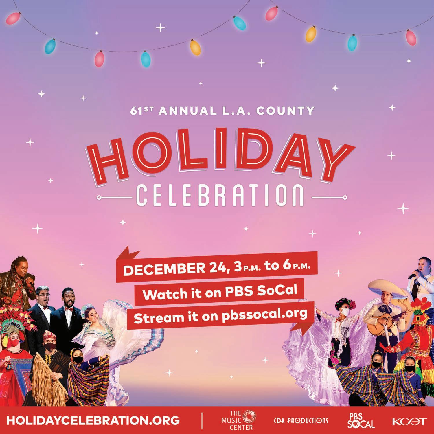 The 61st Annual L.A. County Holiday Celebration was filmed on location, at both The Music Center’s Dorothy Chandler Pavilion and Jerry Moss Plaza, as well as other sites around Los Angeles County, including the Korean Bell of Friendship in San Pedro and Angel’s Point in Elysian Park. A production of The Music Center and PBS SoCal, in association with CDK Productions, the Emmy Award-winning holiday show features choirs, music ensembles and dance companies that represent the many cultures of Los Angeles. To further highlight the county’s rich creative diversity, the broadcast also includes five mini-documentaries, profiling artists from different neighborhoods, and special performances on location at key local landmarks.