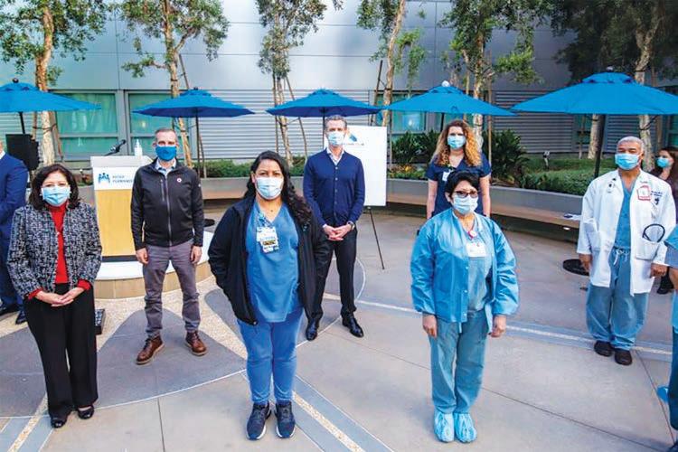 With California Gov. Gavin Newsom, Los Angeles Mayor Eric Garcetti, and California Health and Human Services Secretary Dr. Mark Ghaly along with the chair of the Los Angeles County Board of Supervisors, Supervisor Hilda L. Solis looking on, she was followed by four other healthcare professionals.