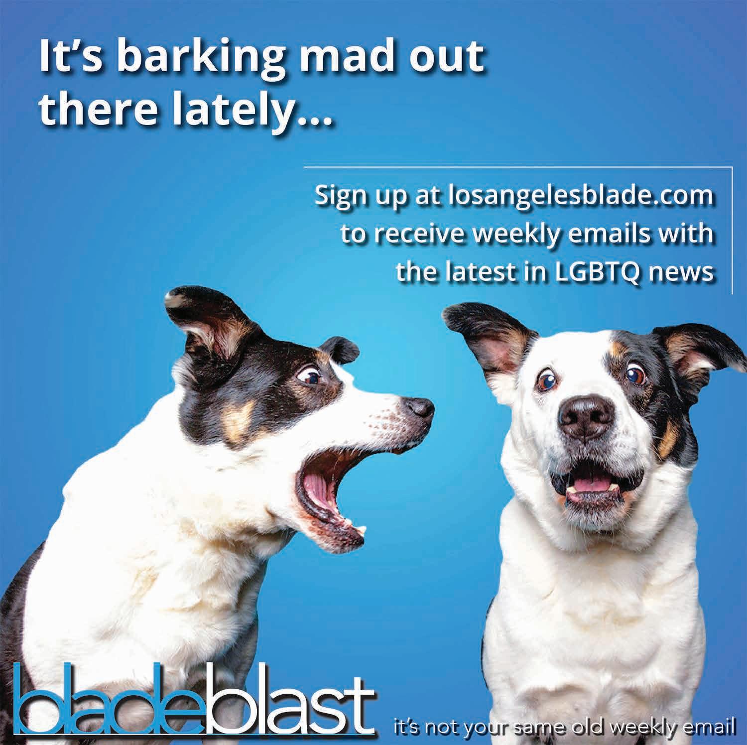 All material in the Los Angeles Blade is protected by federal copyright law and may not be reproduced without the written consent of the Los Angeles Blade. e sexual orientation of advertisers, photographers, writers and cartoonists published herein is neither inferred nor implied. e appearance of names or pictorial representation does not necessarily indicate the sexual orientation of that person or persons. Although the Los Angeles Blade is supported by many ne advertisers, we cannot accept responsibility for claims made by advertisers. Unsolicited editorial material is accepted by the Los Angeles Blade, but the paper cannot take responsibility for its return. e editors reserve the right to accept, reject or edit any submission. A single copy of the Los Angeles Blade is available from authorized distribution points, to any individual within a 50-mile radius of Los Angeles, CA. Multiple copies are available from the Los Angeles Blade o ce only. Call for rates. If you are unable to get to a convenient free distribution point, you may receive a 26-week mailed subscription for $195 per year or $5.00 per single issue. Checks or credit card orders can be sent