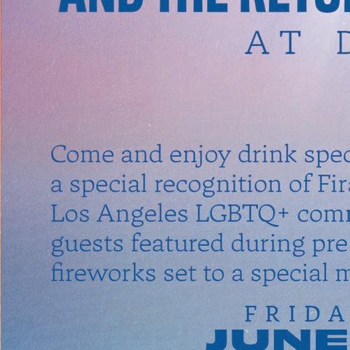 All material in the Los Angeles Blade is protected by federal copyright law and may not be reproduced without the written consent of the Los Angeles Blade. e sexual orientation of advertisers, photographers, writers and cartoonists published herein is neither inferred nor implied. e appearance of names or pictorial representation does not necessarily indicate the sexual orientation of that person or persons. Although the Los Angeles Blade is supported by many ne advertisers, we cannot accept responsibility for claims made by advertisers. Unsolicited editorial material is accepted by the Los Angeles Blade, but the paper cannot take responsibility for its return. e editors reserve the right to accept, reject or edit any submission. A single copy of the Los Angeles Blade is available from authorized distribution points, to any individual within a 50-mile radius of Los Angeles, CA. Multiple copies are available from the Los Angeles Blade o ce only. Call for rates. If you are unable to get to a convenient free distribution point, you may receive a 26-week mailed subscription for $195 per year or $5.00 per single issue. Checks or credit card orders can be