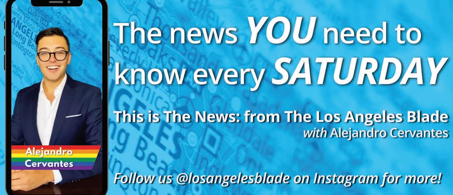 All material in the Los Angeles Blade is protected by federal copyright law and may not be reproduced without the written consent of the Los Angeles Blade. e sexual orientation of advertisers, photographers, writers and cartoonists published herein is neither inferred nor implied. e appearance of names or pictorial representation does not necessarily indicate the sexual orientation of that person or persons. Although the Los Angeles Blade is supported by many ne advertisers, we cannot accept responsibility for claims made by advertisers. Unsolicited editorial material is accepted by the Los Angeles Blade, but the paper cannot take responsibility for its return. e editors reserve the right to accept, reject or edit any submission. A single copy of the Los Angeles Blade is available from authorized distribution points, to any individual within a 50-mile radius of Los Angeles, CA. Multiple copies are available from the Los Angeles Blade o ce only. Call for rates. If you are unable to get to a convenient free distribution point, you may receive a 26-week mailed subscription for $195