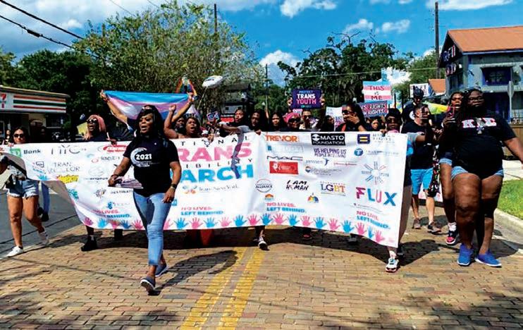 Following the march, members of the transgender community and allies formed a s e ial ontin ent in the annual G ride arade throu h owntown rlando holdin aloft a hu e rans ride a