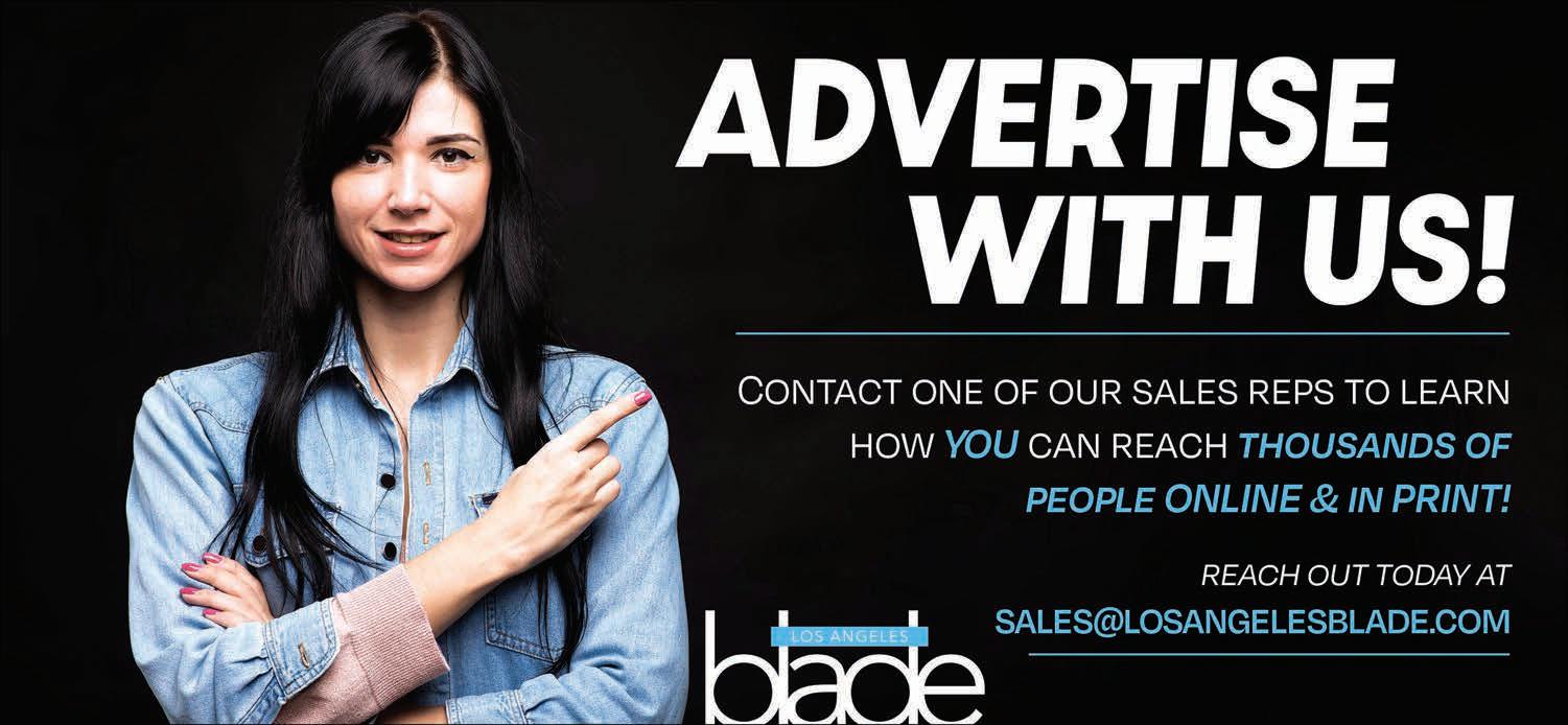 All material in the Los Angeles Blade is protected by federal copyright law and may not be reproduced without the written consent of the Los Angeles Blade. e sexual orientation of advertisers, photographers, writers and cartoonists published herein is neither inferred nor implied. e appearance of names or pictorial representation does not necessarily indicate the sexual orientation of that person or persons. Although the Los Angeles Blade is supported by many ne advertisers, we cannot accept responsibility for claims made by advertisers. Unsolicited editorial material is accepted by the Los Angeles Blade, but the paper cannot take responsibility for its return. e editors reserve the right to accept, reject or edit any submission. A single copy of the Los Angeles Blade is available from authorized distribution points, to any individual within a 50-mile radius of Los Angeles, CA. Multiple copies are available from the Los Angeles Blade o ce only. Call for rates. If you are unable to get to a convenient free distribution point, you may receive a 26-week mailed subscription for $195 per year or $5.00 per single issue. Checks or credit card orders can be sent to Phil Rockstroh at prockstroh@washblade.com. Postmaster: Send address changes to the Los Angeles Blade, PO BOX 53352 Washington, DC 20009. e Los Angeles Blade is published bi-weekly, on Friday, by Los Angeles Blade, LLC. Rates for businesses/institutions are $450 per year. Periodical postage paid at Los Angeles, CA., and additional mailing o ces. Editorial positions of the Los Angeles Blade are expressed in editorials and in editors’ notes as determined by the paper’s editors. Other opinions are those of the writers and do not necessarily represent the opinion of the Los Angeles Blade or its sta To submit a letter or commentary: Letters should be fewer than 400 words; commentaries should be fewer than 750 words. Submissions may be edited for content and length, and must include a name, address and phone number for veri cation. Send submissions by e-mail to tmasters@losangelesblade.com.