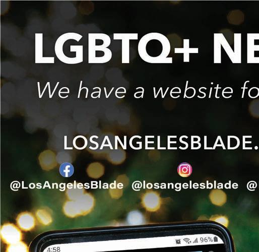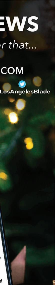 All material in the Los Angeles Blade is protected by federal copyright law and may not be reproduced without the written consent of the Los Angeles Blade. e sexual orientation of advertisers, photographers, writers and cartoonists published herein is neither inferred nor implied. e appearance of names or pictorial representation does not necessarily indicate the sexual orientation of that person or persons. Although the Los Angeles Blade is supported by many ne advertisers, we cannot accept responsibility for claims made by advertisers. Unsolicited editorial material is accepted by the Los Angeles Blade, but the paper cannot take responsibility for its return. e editors reserve the right to accept, reject or edit any submission. A single copy of the Los Angeles Blade is available from authorized distribution points, to any individual within a 50-mile radius of Los Angeles, CA. Multiple copies are available from the Los Angeles Blade o ce only. Call for rates. If you are unable to get to a convenient free distribution point, you may receive a 26-week mailed subscription for $195 per year or $5.00 per single issue. Checks or credit card orders can be sent to Phil Rockstroh at prockstroh@washblade.com. Postmaster: Send address changes to the Los Angeles Blade, PO BOX 53352 Washington, DC 20009. e Los Angeles Blade is published bi-weekly, on Friday, by Los Angeles Blade, LLC. Rates for businesses/institutions are $450 per year. Periodical postage paid at Los Angeles, CA., and additional mailing o ces. Editorial positions of the Los Angeles Blade are expressed in editorials and in editors’ notes as determined by the paper’s editors. Other opinions are those of the writers and do not necessarily represent the opinion of the Los Angeles Blade or its sta To submit a letter or commentary: Letters should be fewer than 400 words; commentaries should be fewer than 750 words. Submissions may be edited for content and length, and must include a name, address and phone number for veri cation. Send submissions by e-mail to tmasters@losangelesblade.com.