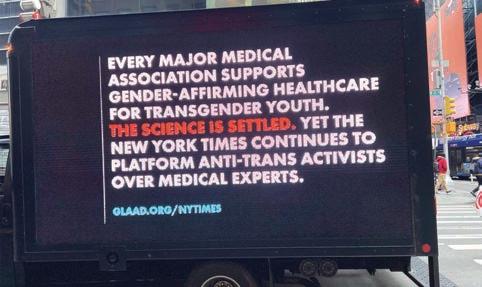 First, GLAAD hired a billboard truck to circle the newspaper’s Manhattan headquarters this morning with signs saying, “Dear New York Times: Stop questioning trans people’s right to exist & access to medical care,” among other messages.