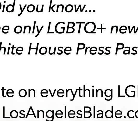 CHRISTOPHER JACKSON, 562-826-6602 All material in the Los Angeles Blade is protected by federal copyright law and may not be reproduced without the written consent of the Los Angeles Blade. e sexual orientation of advertisers, photographers, writers and cartoonists published herein is neither inferred nor implied. e appearance of names or pictorial representation does not necessarily indicate the sexual orientation of that person or persons. Although the Los Angeles Blade is supported by many ne advertisers, we cannot accept responsibility for claims made by advertisers. Unsolicited editorial material is accepted by the Los Angeles Blade, but the paper cannot take responsibility for its return. e editors reserve the right to accept, reject or edit any submission. A single copy of the Los Angeles Blade is available from authorized distribution points, to any individual within a 50-mile radius of Los Angeles, CA. Multiple copies are available from the Los Angeles Blade o ce only. Call for