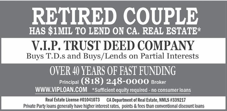 RETIRED COUPLE $$$$ for business purpose Real Estate loans. Credit unimportant. V.I.P. Trust Deed Company www.viploan.com Call 1-818-248-0000. Broker-principal DRE 01041073