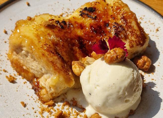 Torrija caramel·litzada amb gelat de vainilla