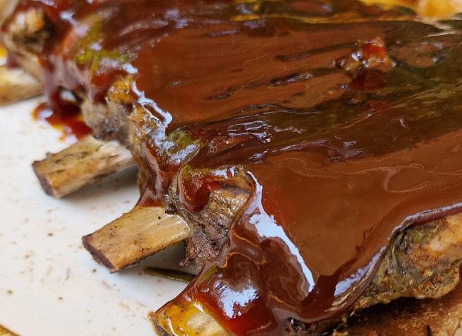 Costella ibèrica cuinada a baixa temperatura, acabada amb un toc a la brasa i herbes aromatiques. Banyat amb salsa barbacoa i acompanyat amb parmentier.