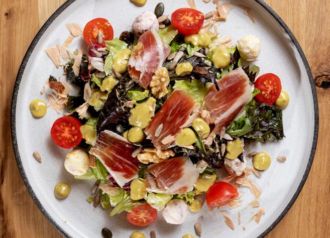 Amanida EL CIELO mezclum amb tomàquet cherry, vinagreta de mel, encenalls de pernil ibèric, boletes de formatge de cabra roulé, encenalls de foie i fruits secs.