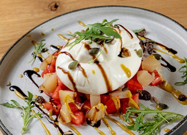 Amanida de burrata, amb pera a la brasa, varietat de tomàquets de l’hort, fruits secs i vinagreta de festuc i mel