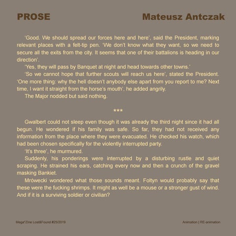 *** Gwalbert could not sleep even though it was already the third night since it had all begun. He wondered if his family was safe. So far, they had not received any information from the place where they were evacuated. He checked his watch, which had been chosen specifically for the violently interrupted party. ‘It’s three’, he murmured. Suddenly, his ponderings were interrupted by a disturbing rustle and quiet scraping. He strained his ears, catching every now and then a crunch of the gravel masking Bankiet. Mrówecki wondered what those sounds meant. Foltyn would probably say that these were the fucking shrimps. It might as well be a mouse or a stronger gust of wind. And if it is a surviving soldier or civilian?