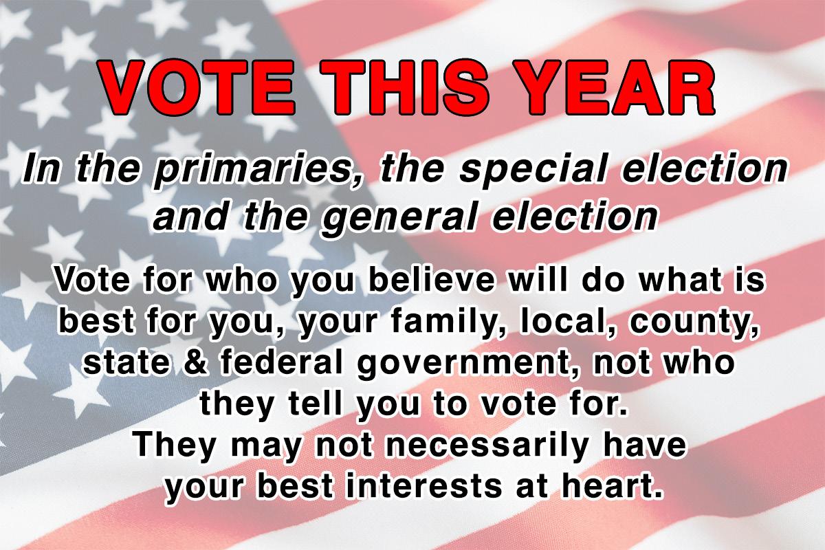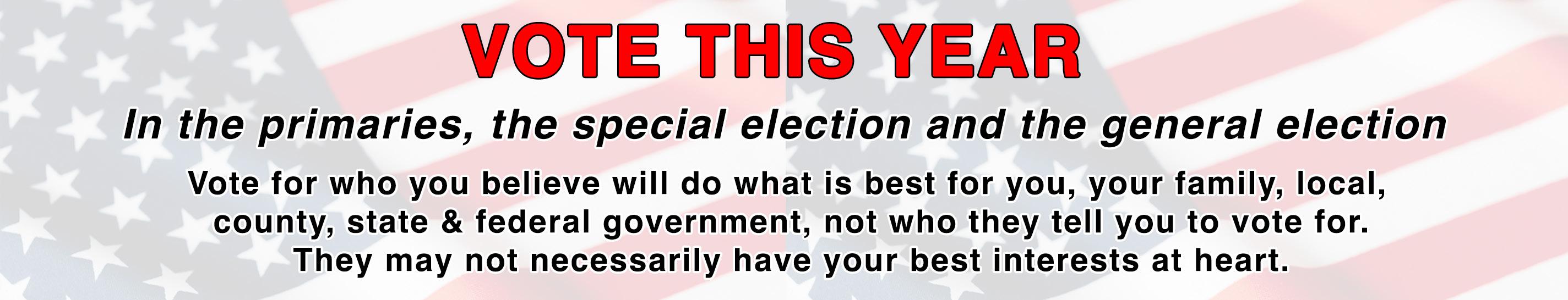 We have a small percentage of the total population, the extremes of both parties that are seriously impacting our lives in a terribly negative way. This year vote in the primaries, the special election, and the general election. They do not want you to vote as the more of us who do vote the more effort, they will have to put in. Make them earn your vote, do not give them an unchallenging ride!