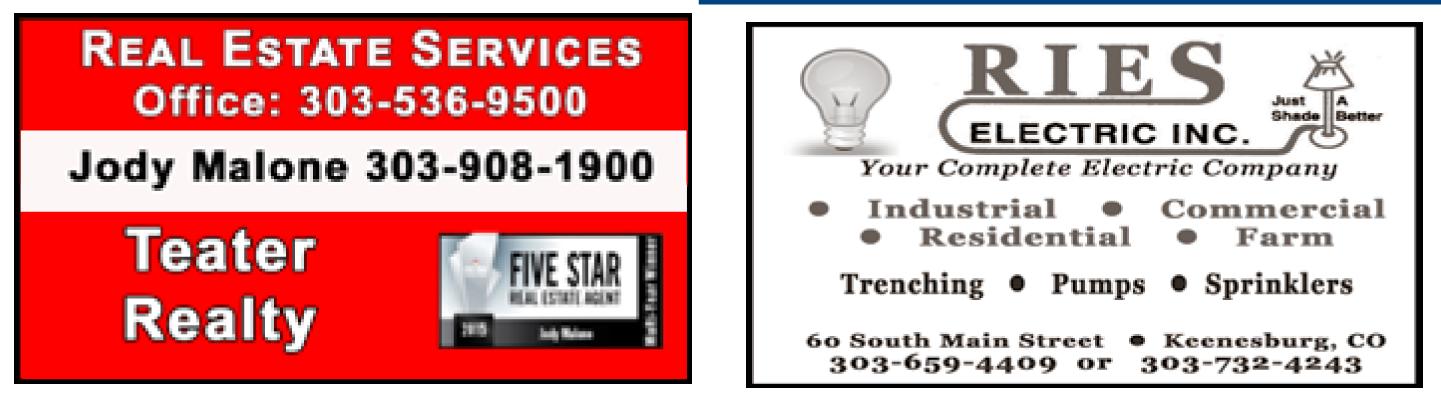 September 20, 2023 LoSt Creek Guide 15 SERVICE DIRECTORY Loaves & Fishes Food Pantry Assistance for Roggen, Keenesburg, Prospect Valley, & Hudson Call to Request Assistance 303-732-4319 Thomas J Croghan DDS Family Dental Practice Appointments: 303-377-8662 New Patients Welcome Appointments Available in Keenesburg and Denver Computer Support R epai R , S e R vice & S ale S Reliable, Local, Professional Roggen Telephone Company 303-849-5260 McCarthy Trucking Recycled asphalt, concrete Great for driveways & parking areas. Also sand & gravel. Reasonable Prices Call Kevin for free quote 303-901-5034 Open Mon. - Fri. 8am - 5pm Family Medical are for All Ages 190 So. Main St., Keenesburg 303-732-4268 Keene Clinic Larry French Accounting Larry French, Public Accountant 111 E. Railroad Avenue, Fort Morgan CO 80701 Phone: 970-867-9040 Fax: 970-867-9008 larry@larryfrenchaccounting.com For Local Colorado Information Visit: www.ourtowncolorado.com TIME TO LOCK IN 2 YEARS OF DEFERRED PAYMENTS* ON FALL DELIVERIES. Act now to lock in the best delivery date and take advantage of deferred payments for two full years on a Zimmatic pivot for fall delivery ONLY FOR A LIMITED TIME TO CLAIM Y O U R OFFE R VISI T LINDSAY.COM/LETSGO HURRY! ©2023 Lind y All R ght R rved Zimma ic nd FieldNET a gis ed d ks f he Lind y C p io *Qu lif d s will b ligib fo 2 y defe ed pay Zimm ti ig y ems wh n fi ing h ugh dsay p d lend ll c s will qu lify fo y ll of h defe ed fin g h y y b d pa edit p fo nd h agg eg d/ f fina cing THE FALL SALES DEAL ENDS SOON! Contact your local dealer today! 115 Central Avenue Wiggins, CO 80654 970-483-7247 Grow your profitability: No payments for 24 months Grow your operation: Lock in your fall delivery date Grow your potential: Your new pivot may pay for itself in productivity before the first payment Universal Construction Inc. Specializing in Remodel, Additions, Decks Patios, Dry Wall, Tile, Framing Stone, Finished Basements, Wood Fence, and much, much more… Petethompson22@hotmail.com Ask for Pete 303-591-6664 hablamos español