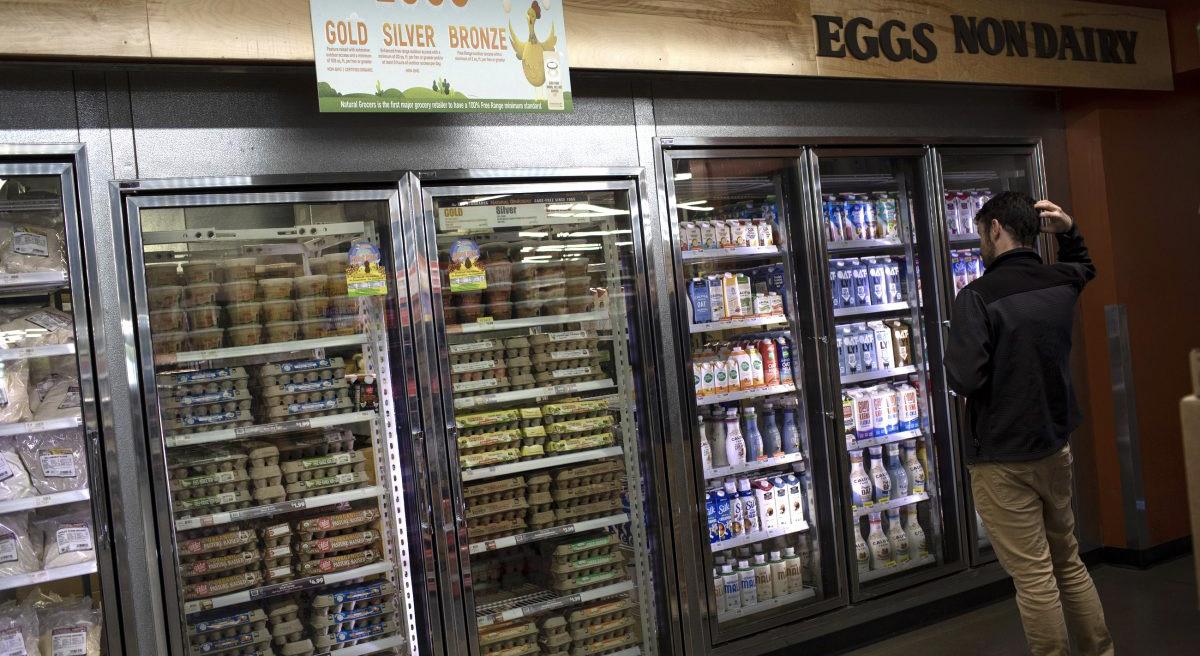 A shopper stops in front of the eggs and milk section inside Natural Grocers Friday in Golden. (Hugh Carey, The Colorado Sun)