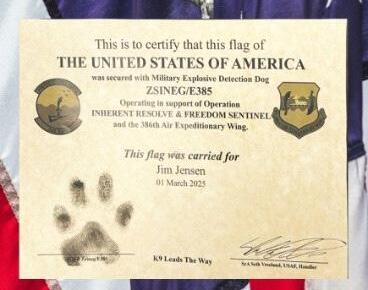 Military Explosive Detection Dog Zsineg/ E385 operating in support of Operation Inherent Resolve & Freedom Sentinel and the 386th Air Expeditionary Wing. This flag was carried for Jim Jensen 01 March 2025.” It proudly bears the motto “K9 Leads the Way,” complete with Zsineg’s paw print and her handler’s signature. How cool is that?”