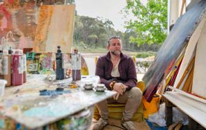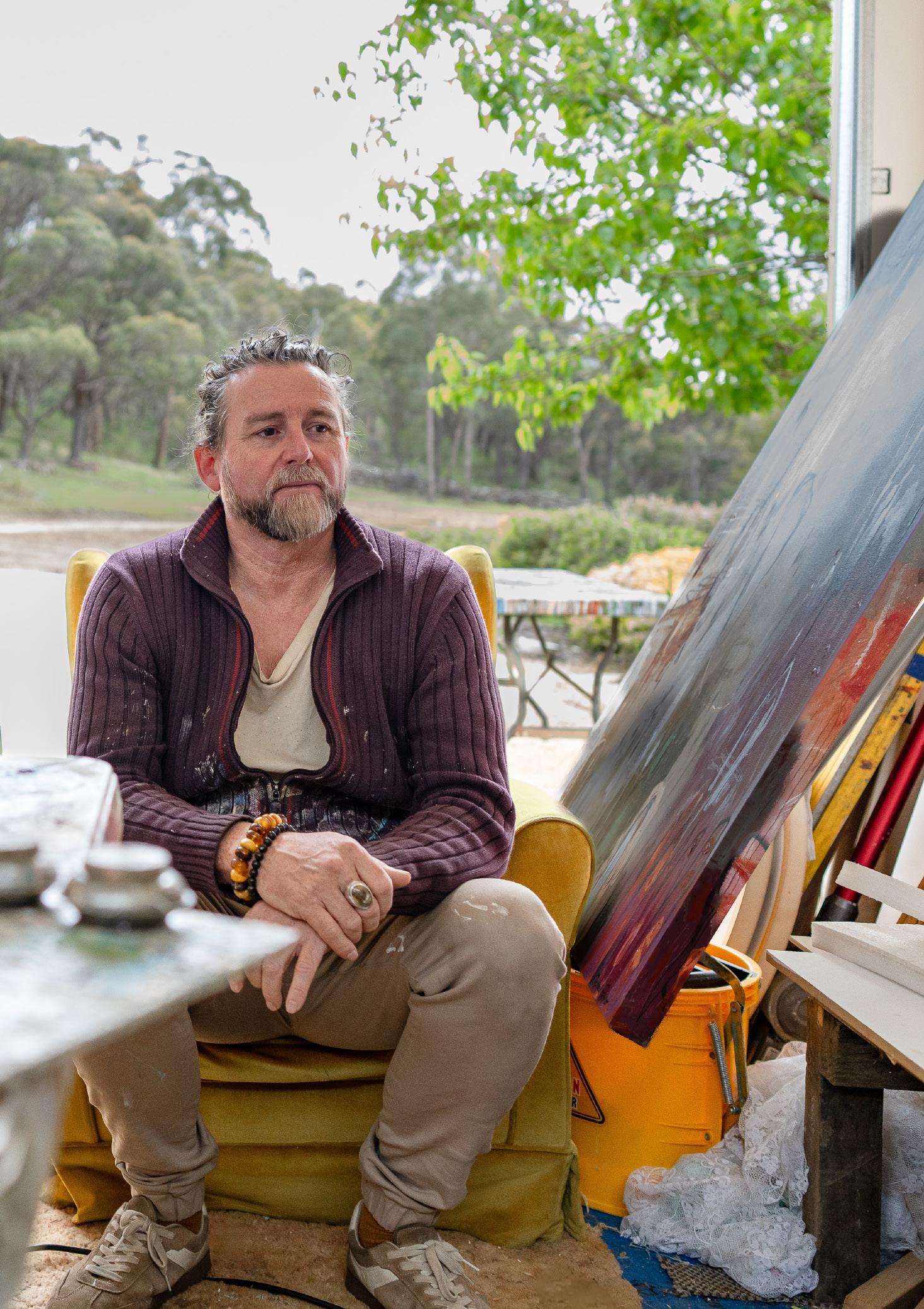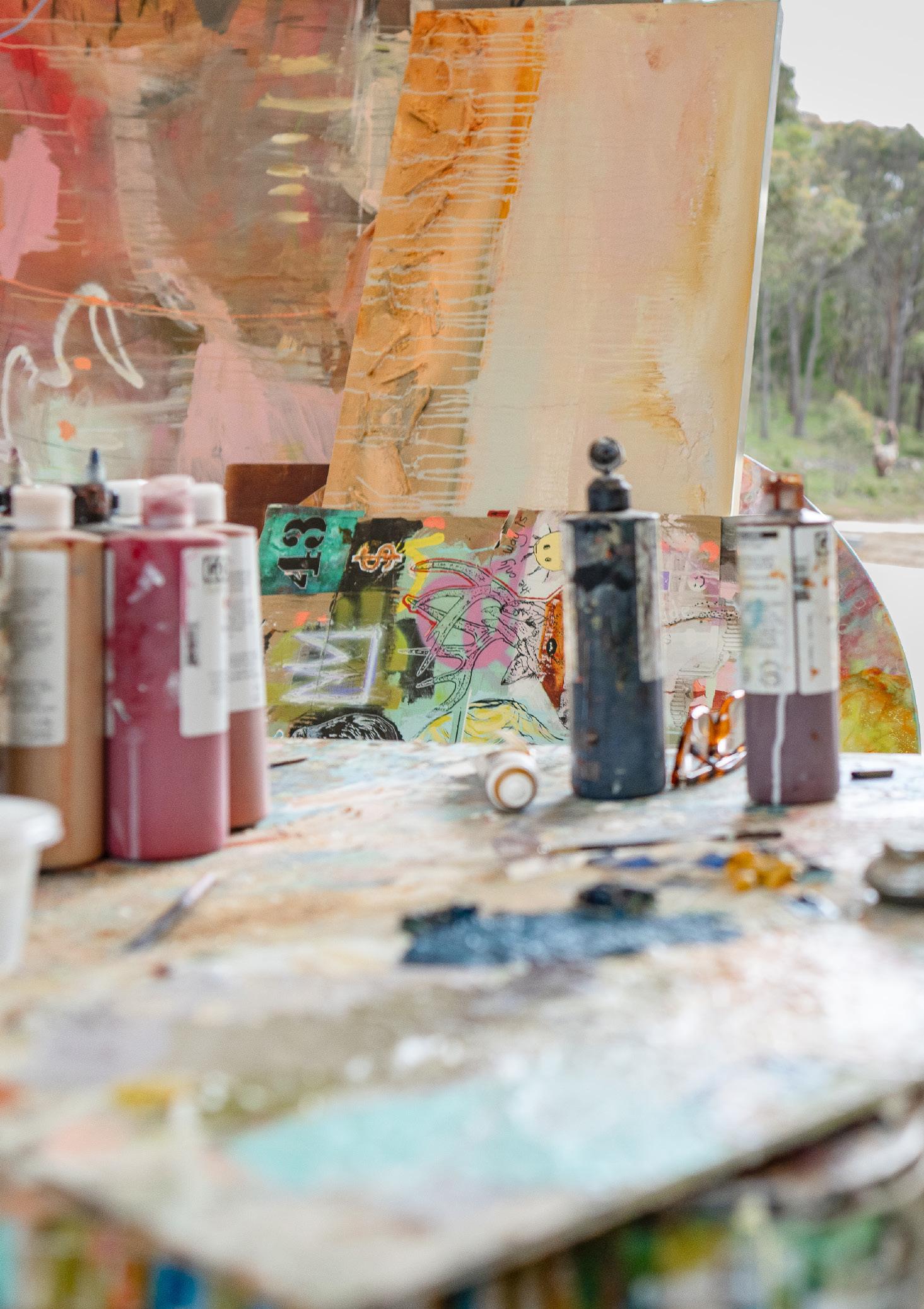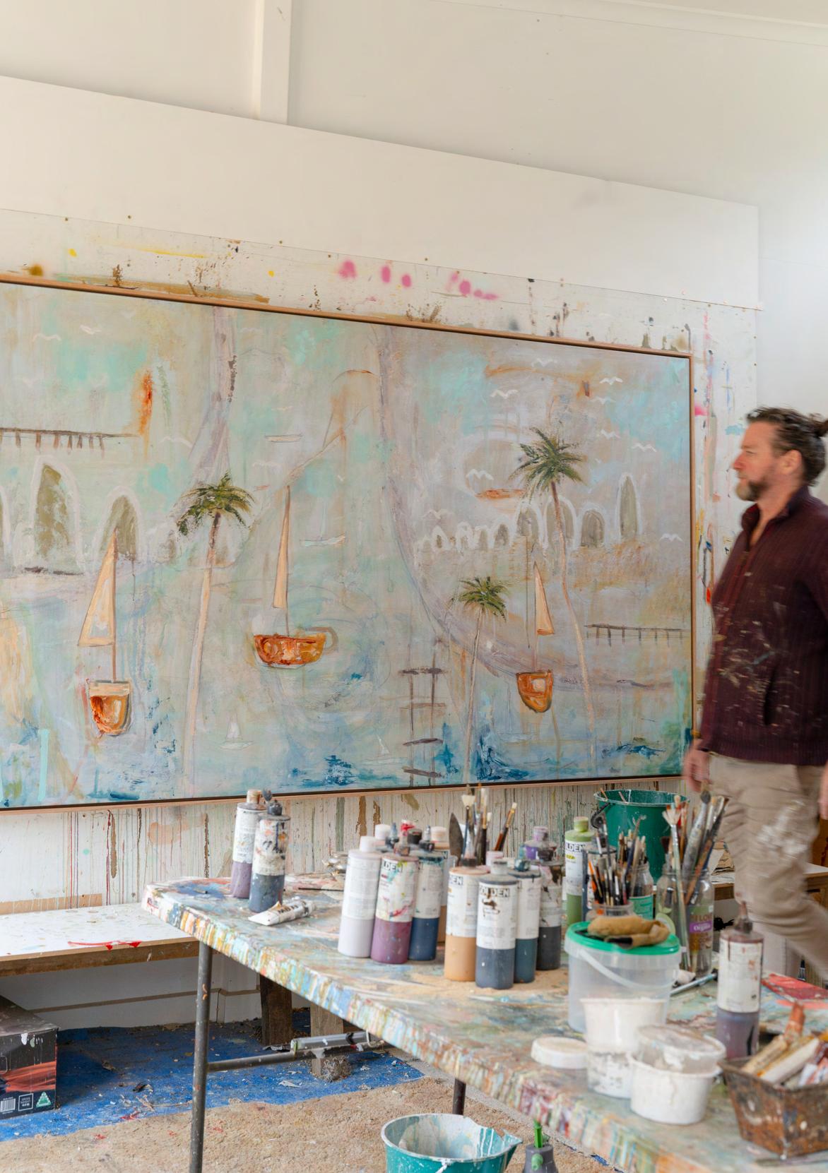 Parker lives and works in the bushland between Daylesford and Fryerstown, Victoria. In that space, time seems to slow. The wide skies, shifting light, and the gentle footsteps of kangaroos, deer, ducks, and rabbits outside his studio windows create a rhythm very different from city urgency. “Living out here gives me a huge sense of space both mentally and physically,” he says. That quiet, that sense of breathing room, shapes not only when he works but how he thinks: ideas get to settle, gestate, evolve. The stillness becomes part of the painting. And that quiet rural setting is more than backdrop: it’s a collaborator.