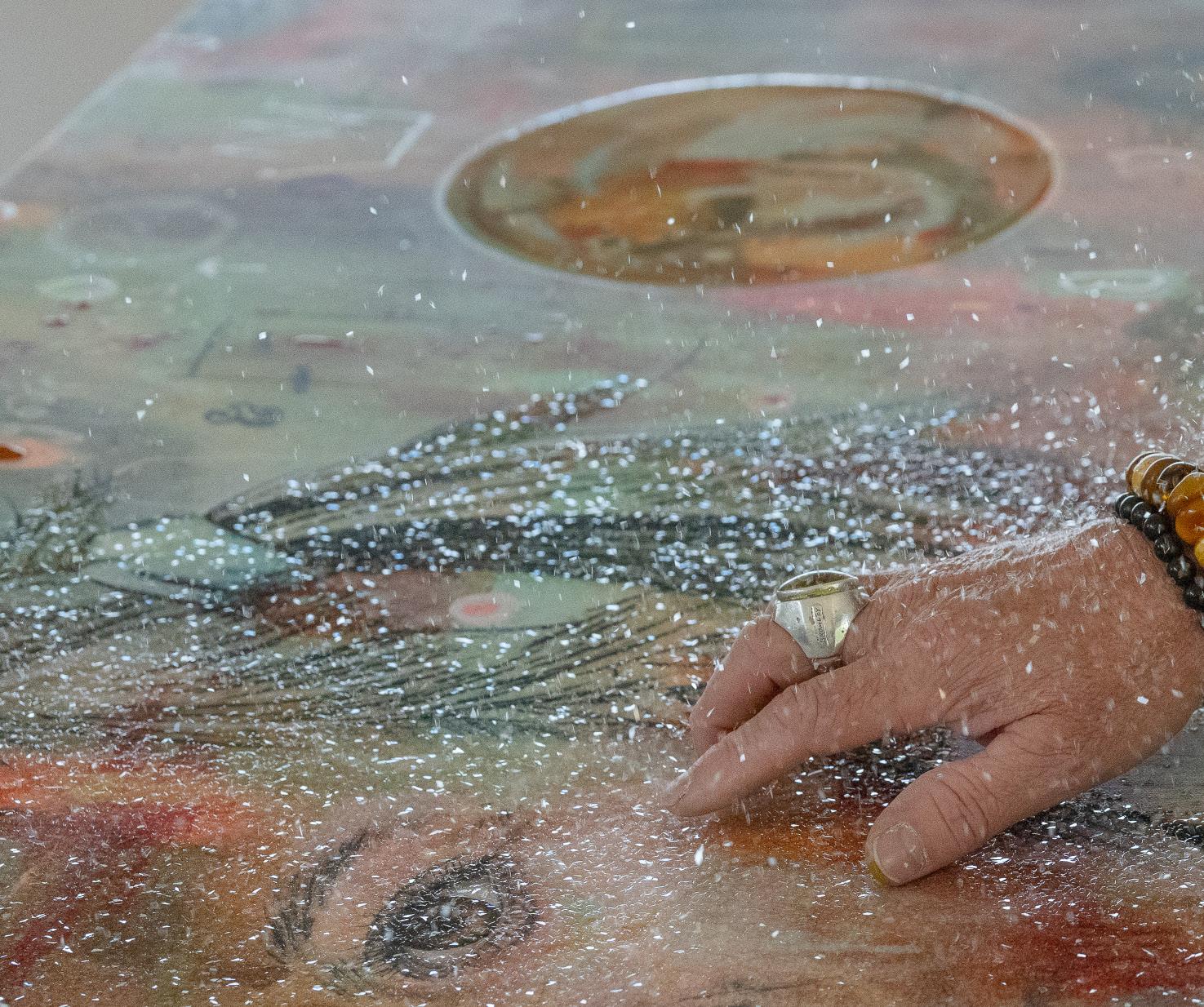 Parker says he believes in the energy of language. “Thoughts become things,” he explains; words slip onto the canvas when it feels right. Sometimes a piece needs none, sometimes a single word is enough to shift its energy entirely. There is no formula. It is an instinctual act, like a heartbeat, quiet but persistent.