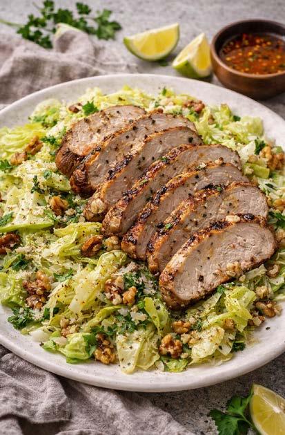 13. Arrange the cabbage salad on plates, slice the pork, and serve on top.