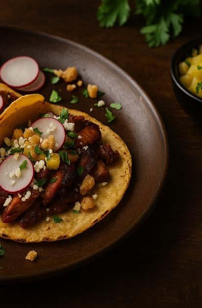 9. Assemble the tacos: layer pork on tortillas, top with pineapple salsa, cotija, cilantro, radishes, and chicharrónes if using.