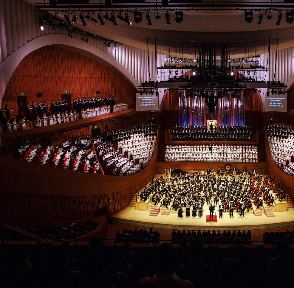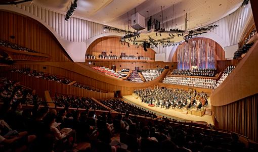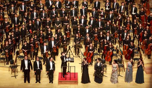 그러나 롯데콘서트홀 공연은 이와는 달랐다. 개관 해에 열린 말러의 <교향곡 8번> 연주는 부제 그대로 '천인'이 함께 했다. 350명에 달하는 어린이 합창단과 500명의 전문 성인 합창단이 객석에 포진했다.