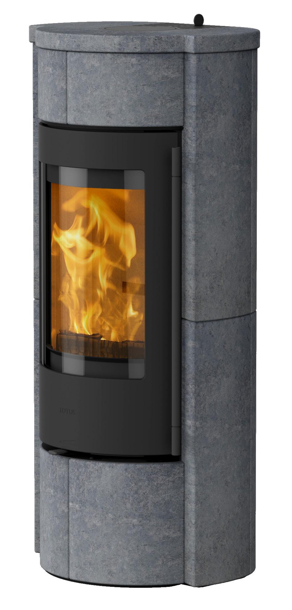 Lotus Visto er beklædt med smukke varmelagrende fedtsten. Hvis du ønsker mulighed for ekstra varmelagring, kan der tilkøbes varmelagringssten, som placeres i ovnens top og afgiver varme, længe efter, at ilden er gået ud.