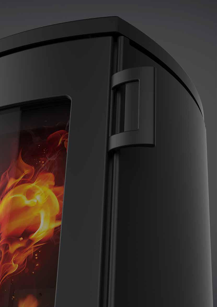 Die Mondo-Serie ist dafür bekannt und beliebt, eine beeindruckende Wärmeleistung sowie Qualität und Design der Spitzenklasse zu bieten, und das zu einem äußerst günstigen Preis. Tür und Holzfachtür bestehen beide aus Gusseisen. Bereits der kleinste Kaminofen der Serie bringt mit den schweren, hochwertigen Materialien beeindruckende 112 kg auf die Waage. Das hohe Gewicht gewährleistet die Effizienz des Kaminofens und ist der Garant für eine saubere, solide Verarbeitung. Alle Modelle sind serienmäßig mit dem komfortablen Soft Close-Schließsystem von Lotus ausgestattet. Hierzu kann eine der Griffoptionen Classic, Modern oder Shape beliebig kombiniert werden. Alle drei Griffe sind so gestaltet, dass sie eine optimale Bedienung im Alltag ermöglichen. Lesen Sie mehr über die einzelnen Öfen der Mondo-Serie auf den folgenden Seiten sowie über die verschiedenen Oberflächen und ihre Eigenschaften auf Seite 106.