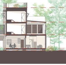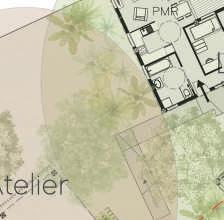Le RDC est fragmenté en plusieurs zones : un espace public avec un cheminment reliant la ville à son littoral, un espace semi privé avec des ateliers accessibles aux résidents, et en fond de parcelle une zone privée consitituée de 2 logements PMR.