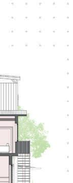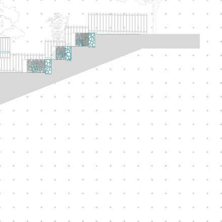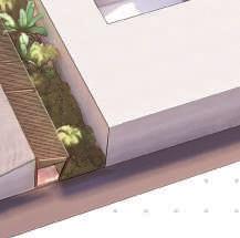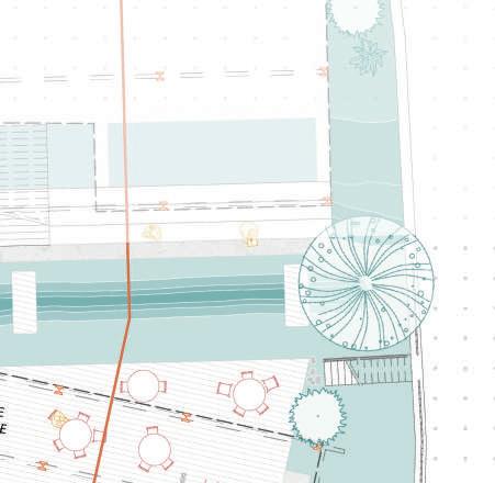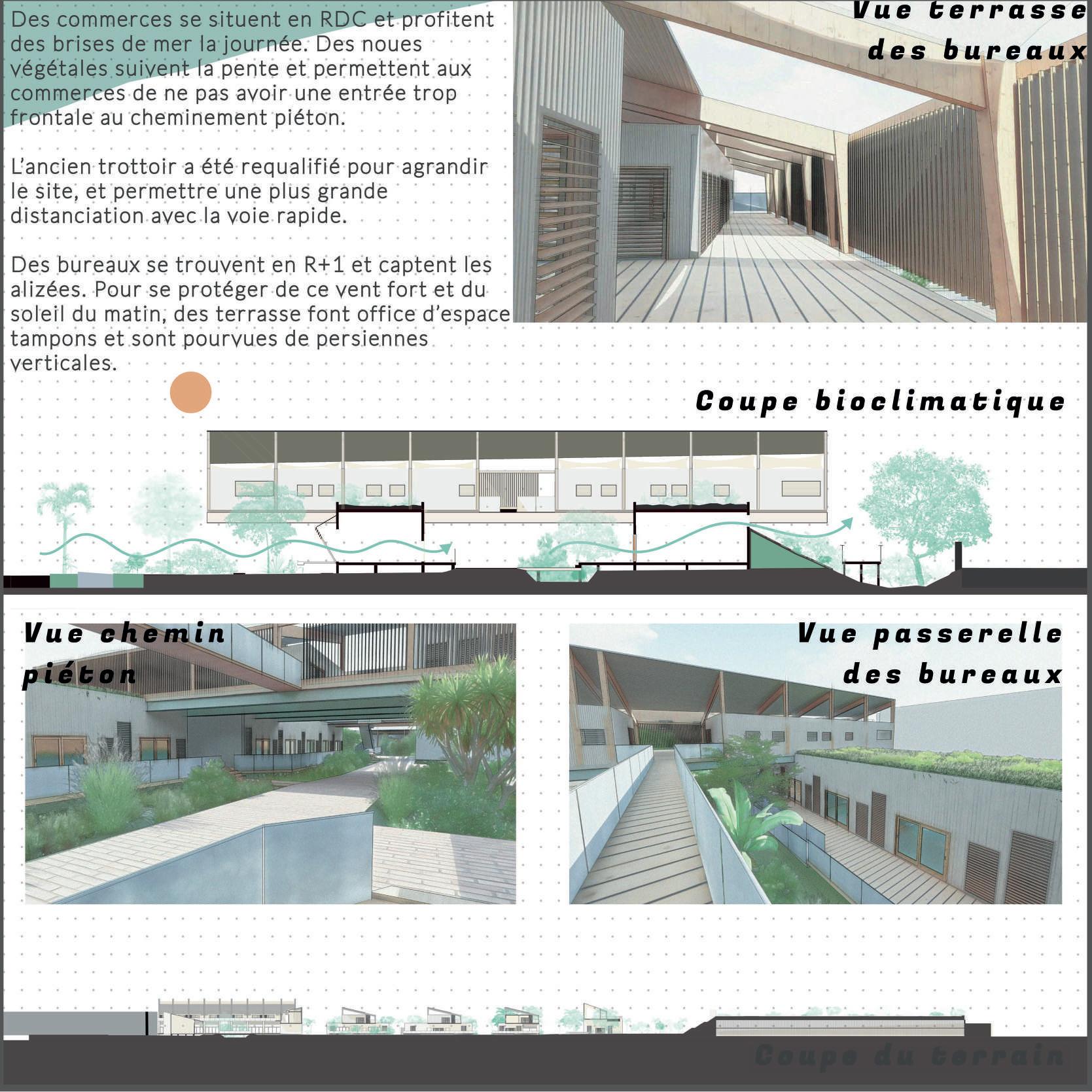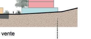 Des commerces se situent en RDC et profitent des brises de mer la journée. Des noues végétales suivent la pente et permettent aux commerces de ne pas avoir une entrée trop frontale au cheminement piéton.