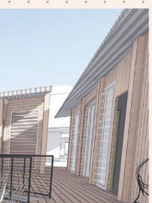Les débords de toitures et les protections solaires apportent de l’ombre en façades et aux coursives.