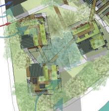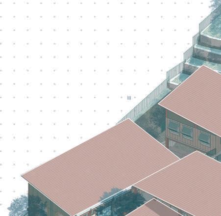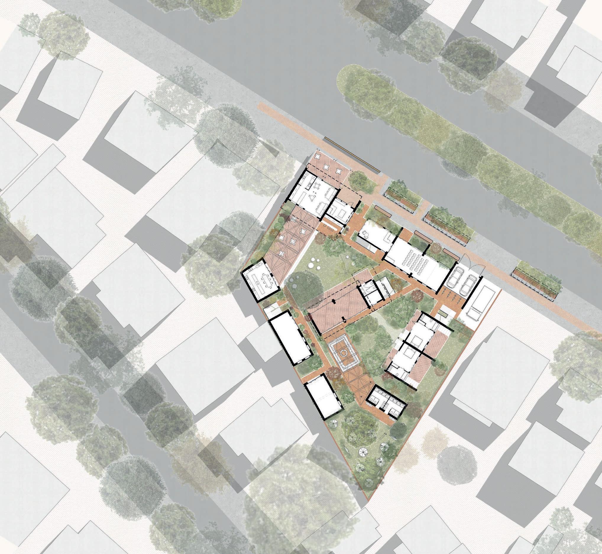 Le projet s’organise autour d’un jardin potager servant les habitants. Les cabinets médicaux se trouvent sur la limite ouest, afin de protéger ce cœur de la route. Les espaces d’attentes se situent à l’extérieur et donnent vus sur la végétation.