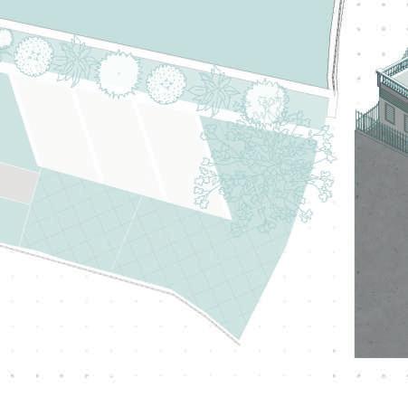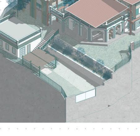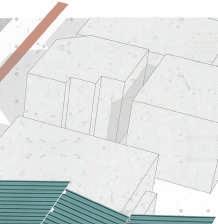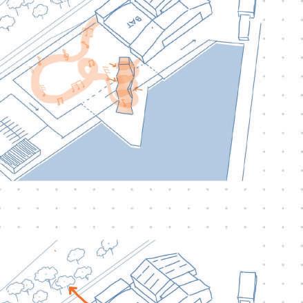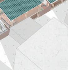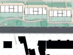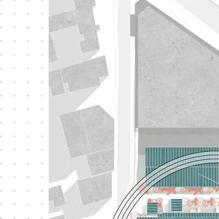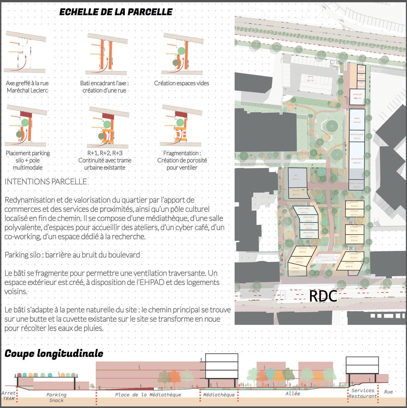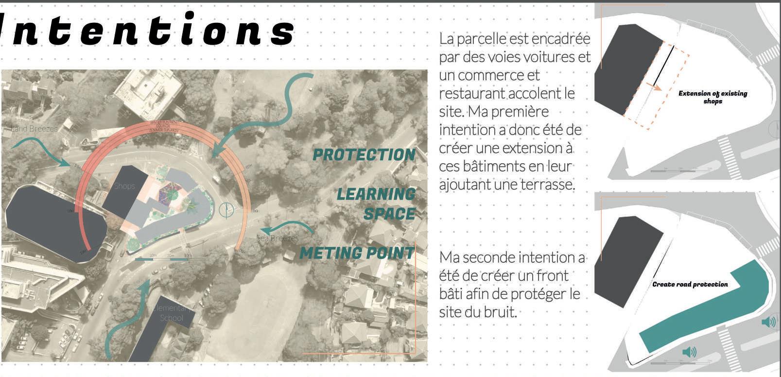 La parcelle est encadrée par des voies voitures et un commerce et restaurant accolent le site. Ma première intention a donc été de créer une extension à ces bâtiments en leur ajoutant une terrasse. Ma seconde intention a été de créer un front bâti afin de protéger le site du bruit. Espace d’apprentissage Marché et commerces
