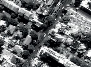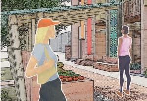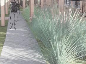 Les bâtiments suivent la pente du site et les toitures sont inclinées sur des jardinières bordant les trottoirs.