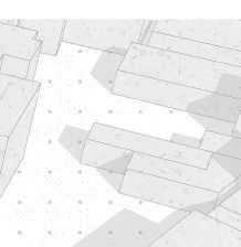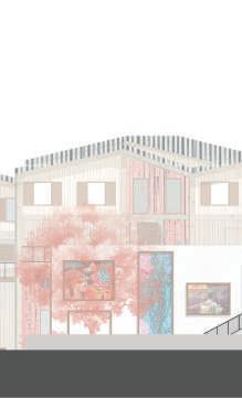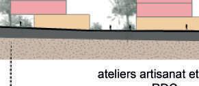 Le parti de mon projet fut de créer une alternance d’espace bâti et non bâti afin de multiplier les usages de la parcelle. Les bâtiments qui font front à la route permettent d'offrir des services au quartier. Les ateliers se situent tous au RDC, permettant de le rendre public et de créer une promenade artistique, entre l’ancien projet urbain et la cité des arts.