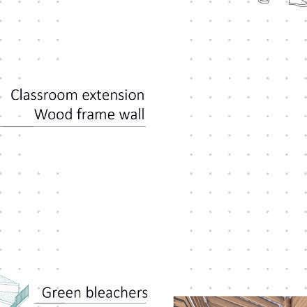 L’extension sur le bâtiment coloniale possède une structure indépendante en poteaux poutre en bois. Plus large que le bâtiment au RDC, elle permet de protéger les façades est et ouest. Dans un souci de place, nous avons dessiné des classes pouvant se mutualiser grâce à un système de parois inclinable.