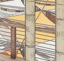 Le principe de construction est simple et répétitif : il repose sur différents types de portiques en bambou qui, soient créés des cheminement ombragés, soit créer des espaces de haltes.